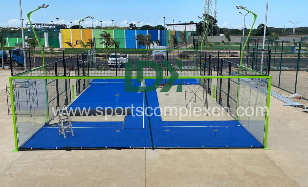 For this Venezuela location, we engineered a customized outdoor panoramic padel court with a durable spigot structure. This specific engineering ensures maximum structural integrity and safety while providing a bespoke, sleek modern aesthetic that perfectly complements the club’s premium branding.