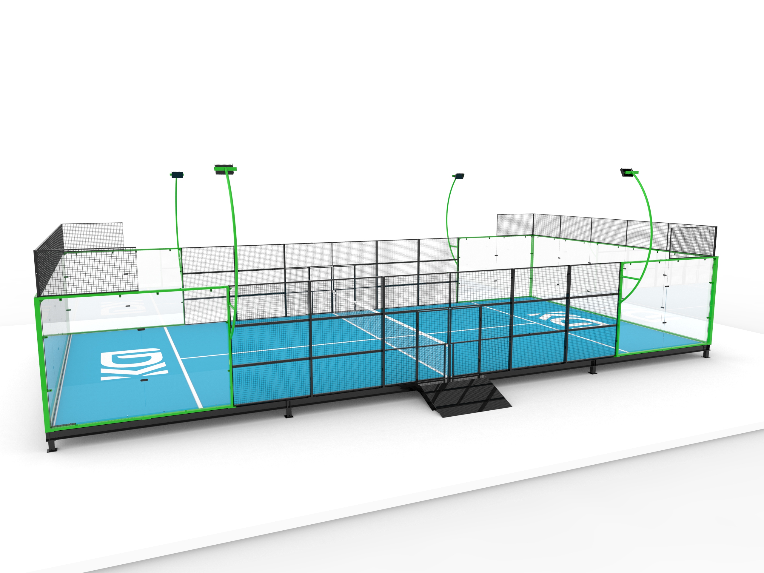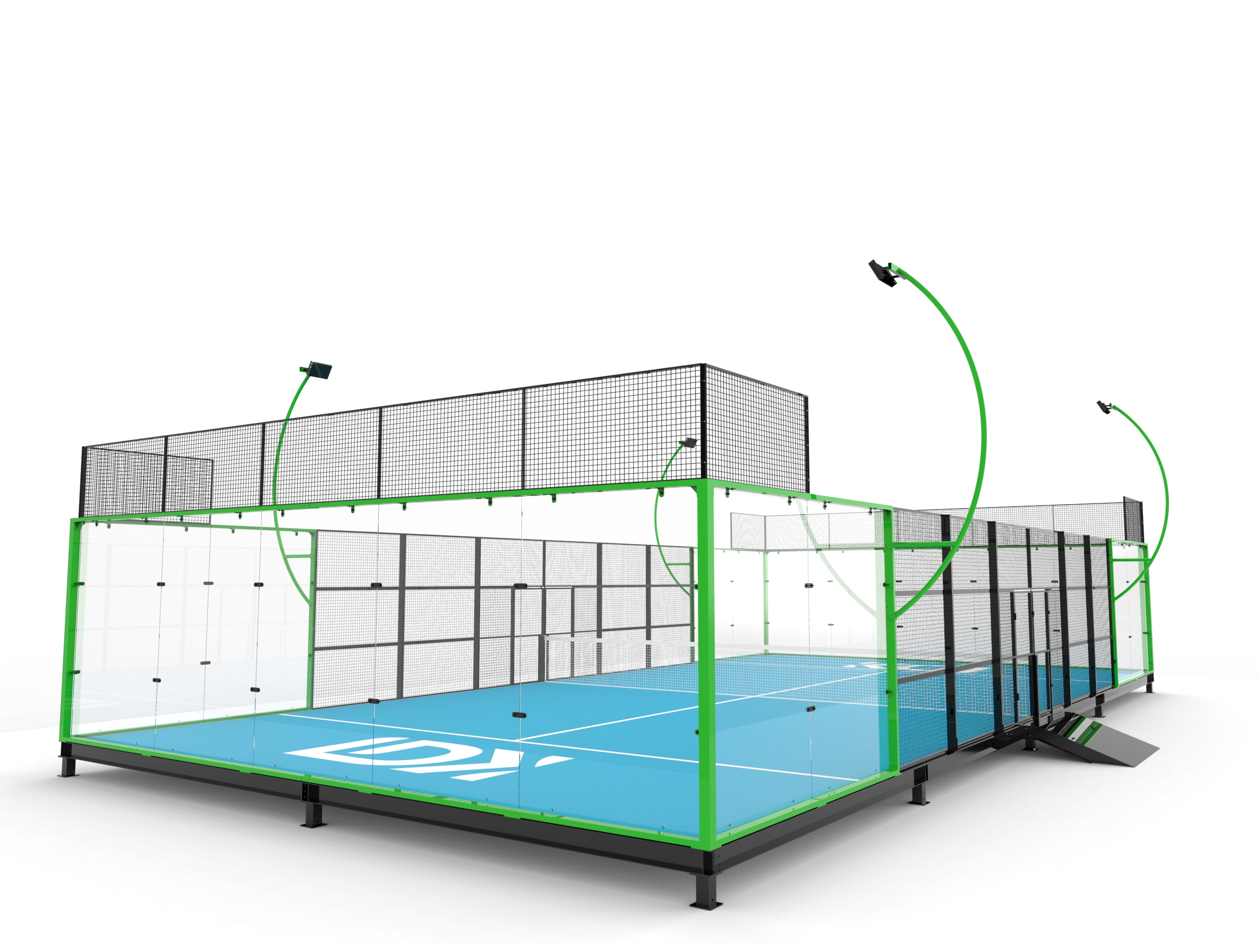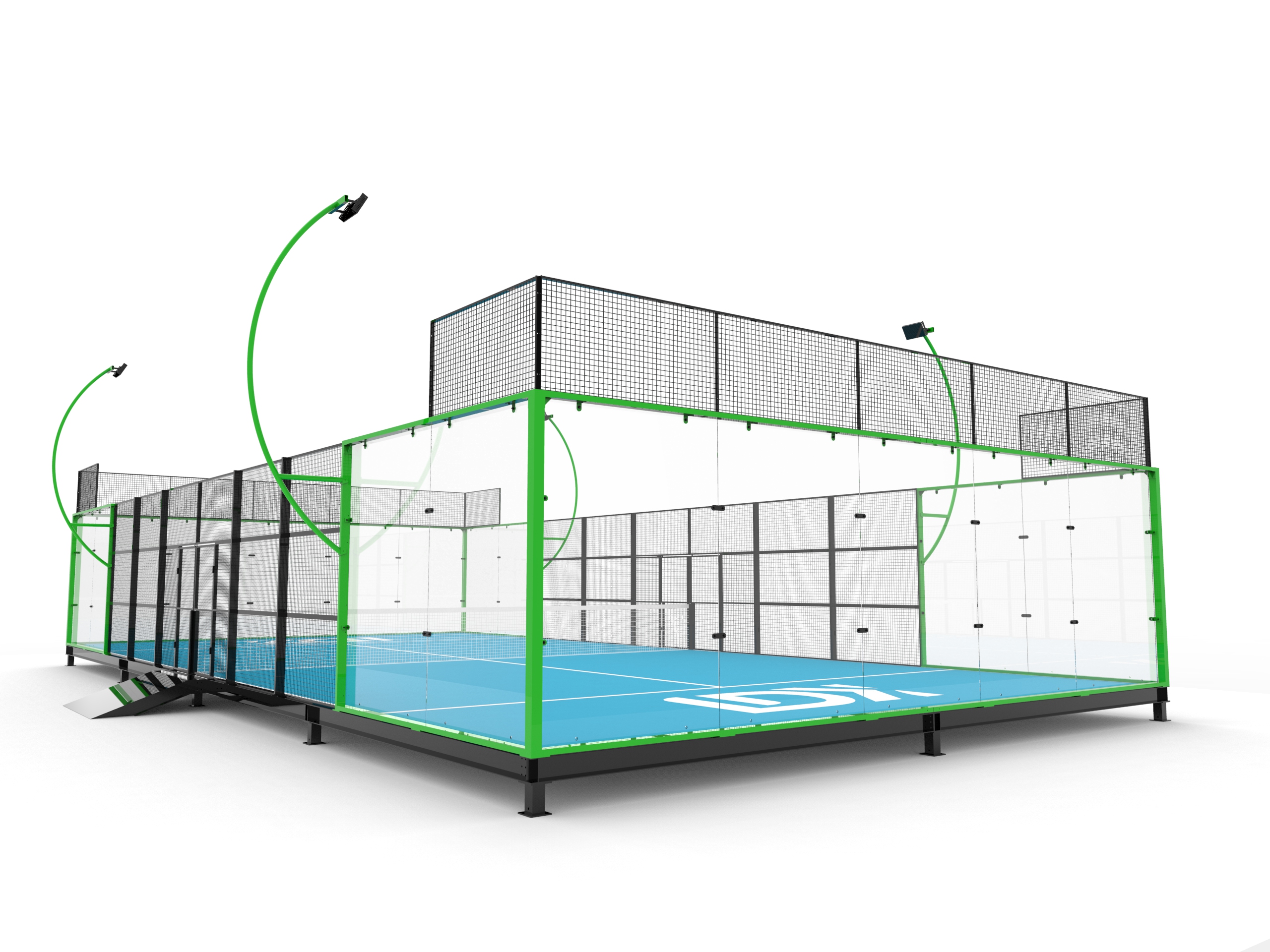 This portable padel court features a self-contained steel foundation, eliminating the need for ground civil work and making it ideal for temporary events or venues. Built with durability in mind, it uses 12mm ultra-white safety glass and high-grade galvanized mesh for enhanced safety and aesthetics.